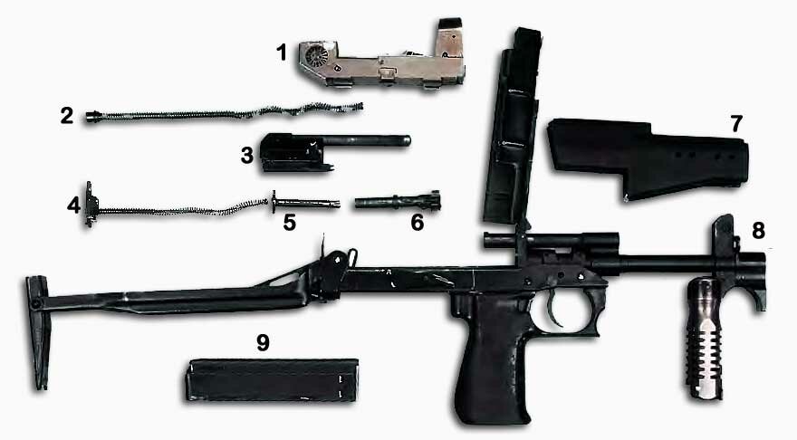 Пистолет-пулемет СР2М в неполной разборке: 1 — коллиматорный прицел КП-СР2; 2 — возвратный механизм; 3 — затворная рама; 4 — боевая пружина с направляющей; 5 — ударник; 6 — затвор; 7 — цевье; 8 — ствол с коробком автоматики, трубкой, прицельным приспособлением, спусковым механизмом и прикладом; 9 — магазин.