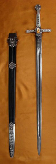 Скандинавский меч, который еще называют норманским, очень хорошо подходил рослым и физически сильным викингам. Он был достаточно толстым в поперечнике, имел очень массивный противовес (у некоторых мечей размером почти с кулак) и небольшую гарду (или вообще не имел ее). Некоторые мечи имели на навершии крюк или небольшой крюкообразный клинок, которым можно было атаковать противника, уведя в сторону его меч основным клинком. Мечи 9 - 10 вв. имеют ровный широкий клинок, закругленный к концу, и являются только рубящим оружием. Мечи 11 - 12 вв. С заостренными концами и слегка сужающимися книзу клинками имеют значение не только рубящего оружия, но и колющего. Мечи изготовляли из железа и сварочного булата. В конце 12 в. рукоять меча удлиняется настолько, что позволяет действовать двумя руками. В этот период мечи имеют заточенные у острия клинки, способные проникать сквозь сочленения доспехов. Ножны у меча деревянные и покрываются кожей или материей и привязываются к поясной портупее на перевязи, каждый конец которой, разрезанный на ремни, образует плетеное кожаное кольцо. Ремни эти обычно покрыты бархатом, шелком и шиты золотом, а иногда украшены финифтью. К этому времени относится появление рыцарского оружия. Рыцарские мечи выделяются своей красотой, считаясь благородным оружием. В продолжение месяцев их оставляли лежать на алтарях, они участвовали в литургии, их благословляли священники и даже освящали. Лучшие хранились в сокровищницах монастырей под алтарями, на могилах своих бывших владетелей. Им дают имена, как это делалось еще во времена Каролингов; при инвеституре, короновании, посвящении они участвуют в церемонии в силу строго соблюдаемого завета. Их происхождению часто приписывали сверхъестественный характер; некоторые из них якобы обладали волшебными свойствами. В первой четверти 14 в., после внедрения латного доспеха, клинок рыцарского меча стал длиннее, что увеличивало силу его удара и дистанцию. Так появился полутораручный меч, сначала в Германии, потом в Англии, затем - в остальных странах Западной Европы. В настоящее время, согласно европейской классификации, под коротким мечом понимается меч длиной до 60 см (2 фута), длинным - от 60 до 115 см (2 - 3,5 фута), полутораручным - 115 - 145 см (3,5 - 4,5 фута), двуручным - больше 5 футов, то есть 152 см. Клинок последнего был шириной 5 - 6 см. Длина его рукояти составляла около 30 см, весил он от 3,5 до 5 кг. Двуручный же "тяжелый меч" весил до 8 кг и мог доходить в длину до 2 м. На Руси меч являлся дорогостоящим предметом вооружения, часто передавался от отца к сыну. Мечи 10-12 вв. имеют клинок длиной около 100 см, шириной 4 - 6 см, толщиной средней части клинка 3 - 6 мм. Переход в 14 - 15 вв. от кольчуги к наборным доспехам повлиял и на эволюцию меча. Доспехи в бою легче было проколоть, чем разрубить. Поэтому прежнее рубящее действие меча заменяется в 14 в. на колюще-рубящее. Мечи становятся длиннее (до 120 - 140 см). Их рукоять делают большой, крестовину прямой и длинной (до 26 см). На клинке меча появляются трехрядные долы. а) черен\рукоять